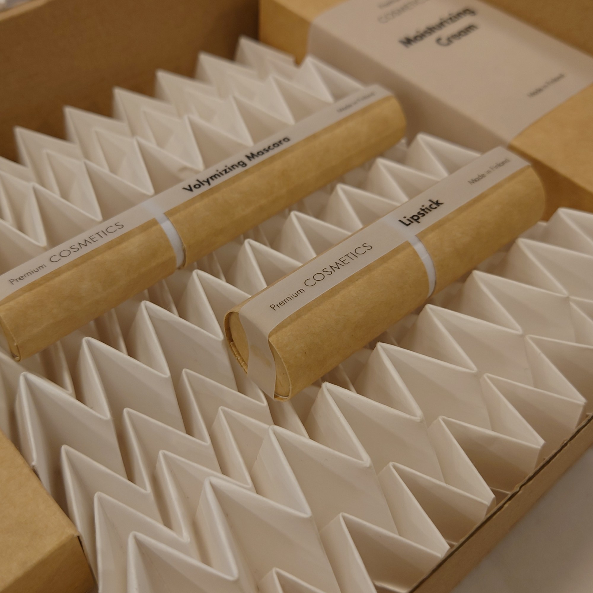 The exhibited pieces consisted of three different solutions using the same foldable pattern: a protective layer for glass bottles, a folded e-commerce packaging solution for cosmetics, and a folded cover for ceramic bowls. The idea was to show how functional the structures can be for various different applications in the e-com sector.