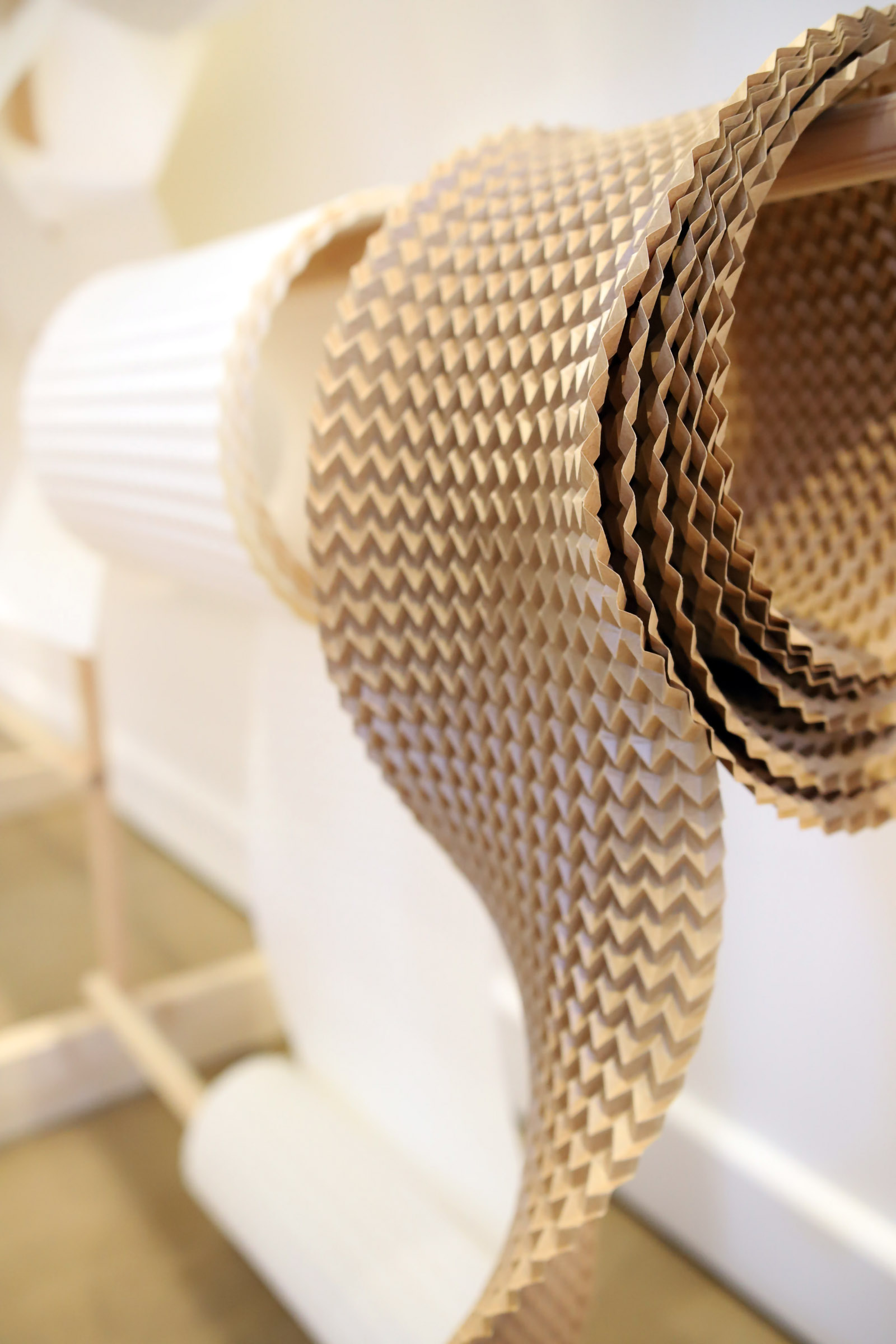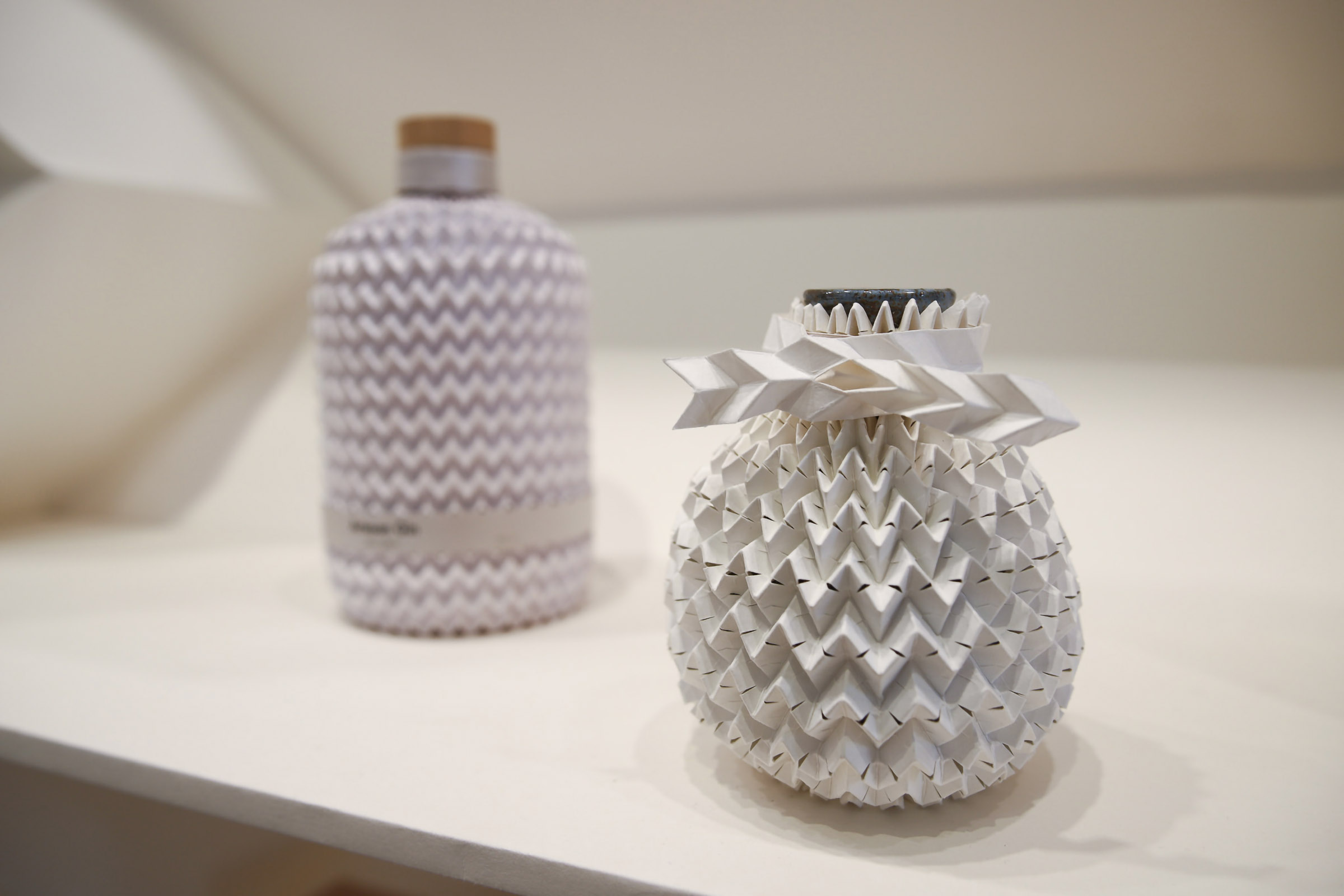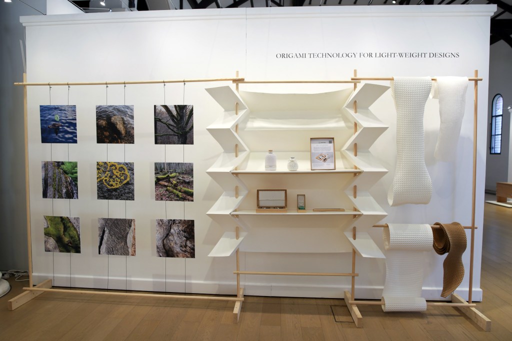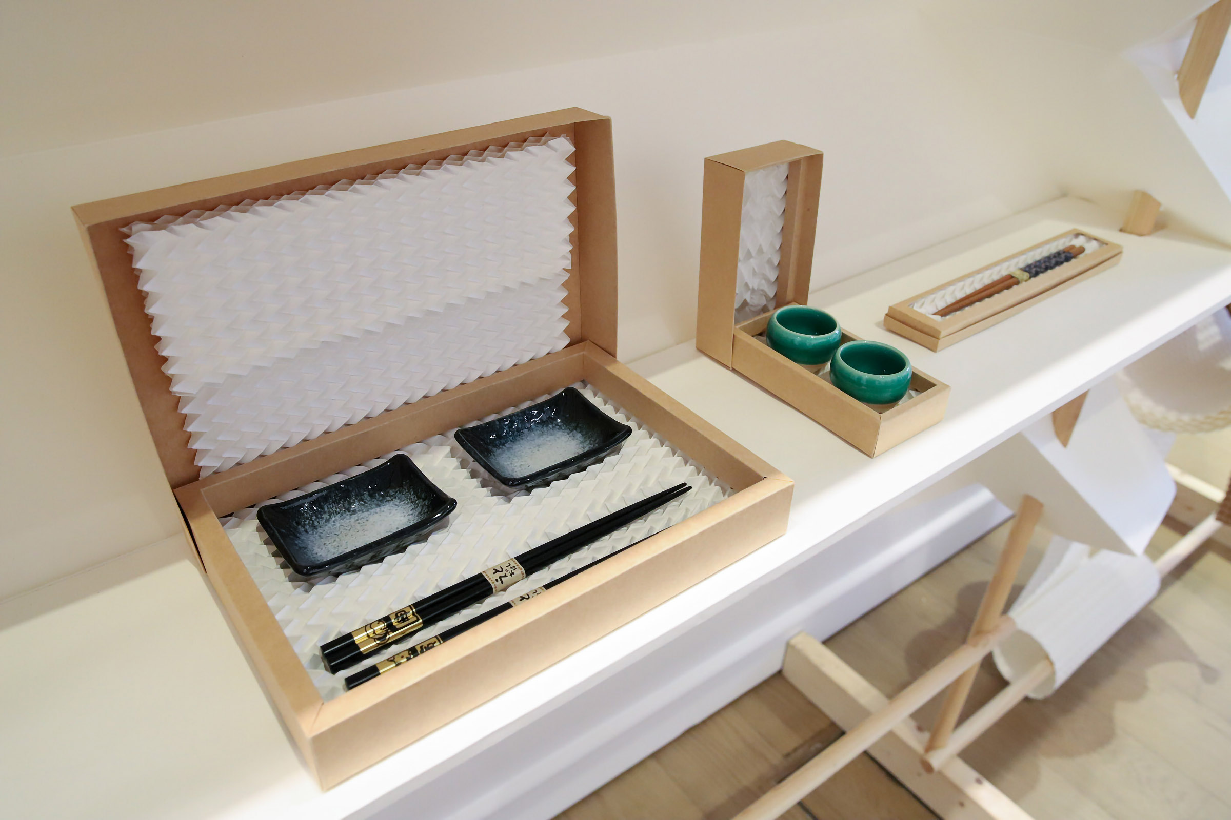 FOLD part of the exhibition showcases the latest outcomes of the novel folding technology developed in the project. The folded wall installation has attracted interest right from the opening of the exhibition. The exhibition presents Miura-ori shapes manufactured from commercially available cardboard rolls in various qualities and thicknesses, shown in different stages and applications. The pattern, available in two scales, has broad application potential. It functions as a flexible cushioning material, that absorbs forces acting on the product and helps keep it securely in place inside the package. As versatile examples, the exhibition presents packaging solutions in which the folded material is shaped to match the product precisely through additional folds, cuts, layered structures and custom inserts developed within the project. On display are packaging applications based on machine-folded cardboard for, among other things, bottles, ceramics and sushi utensils.