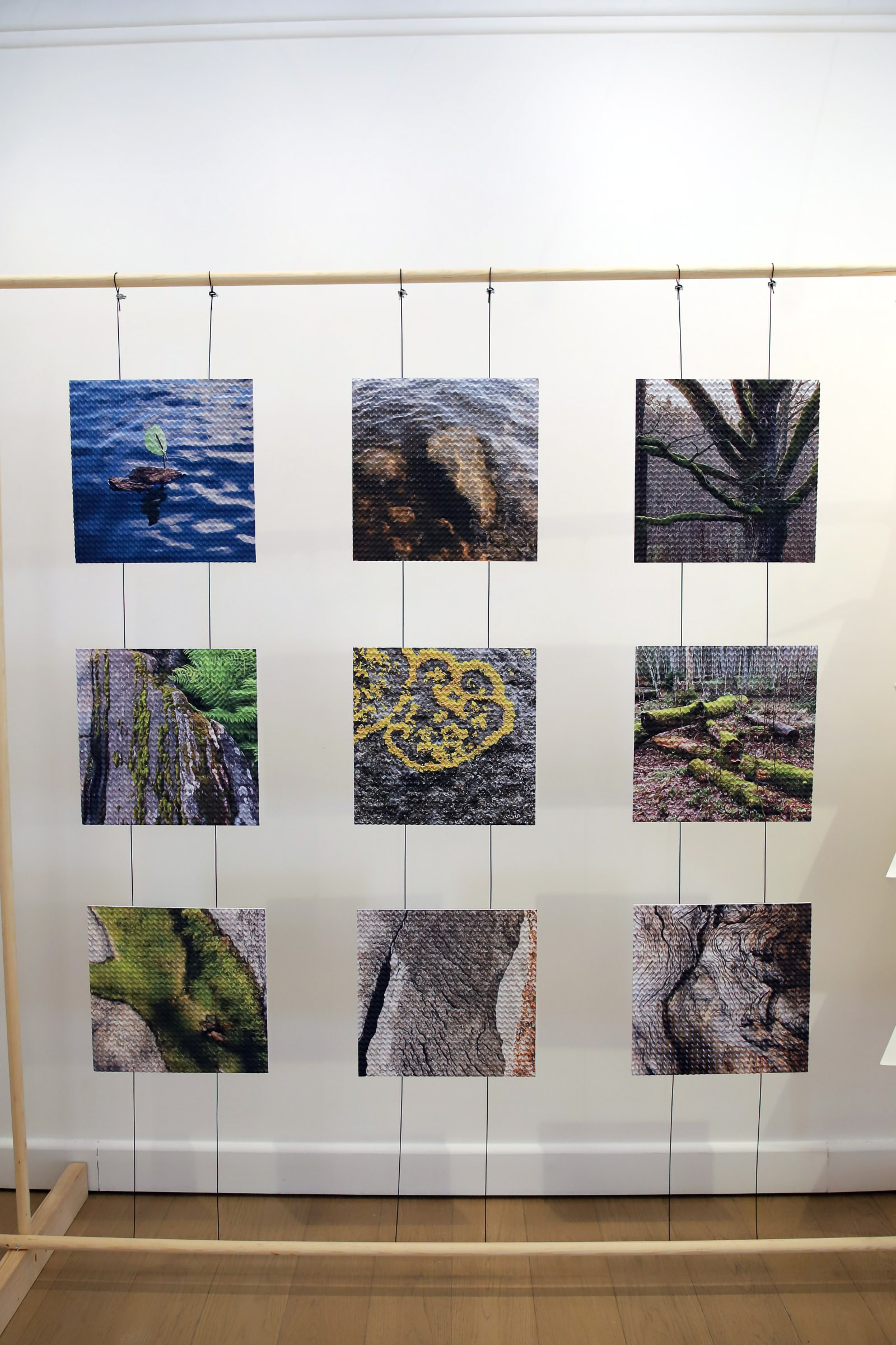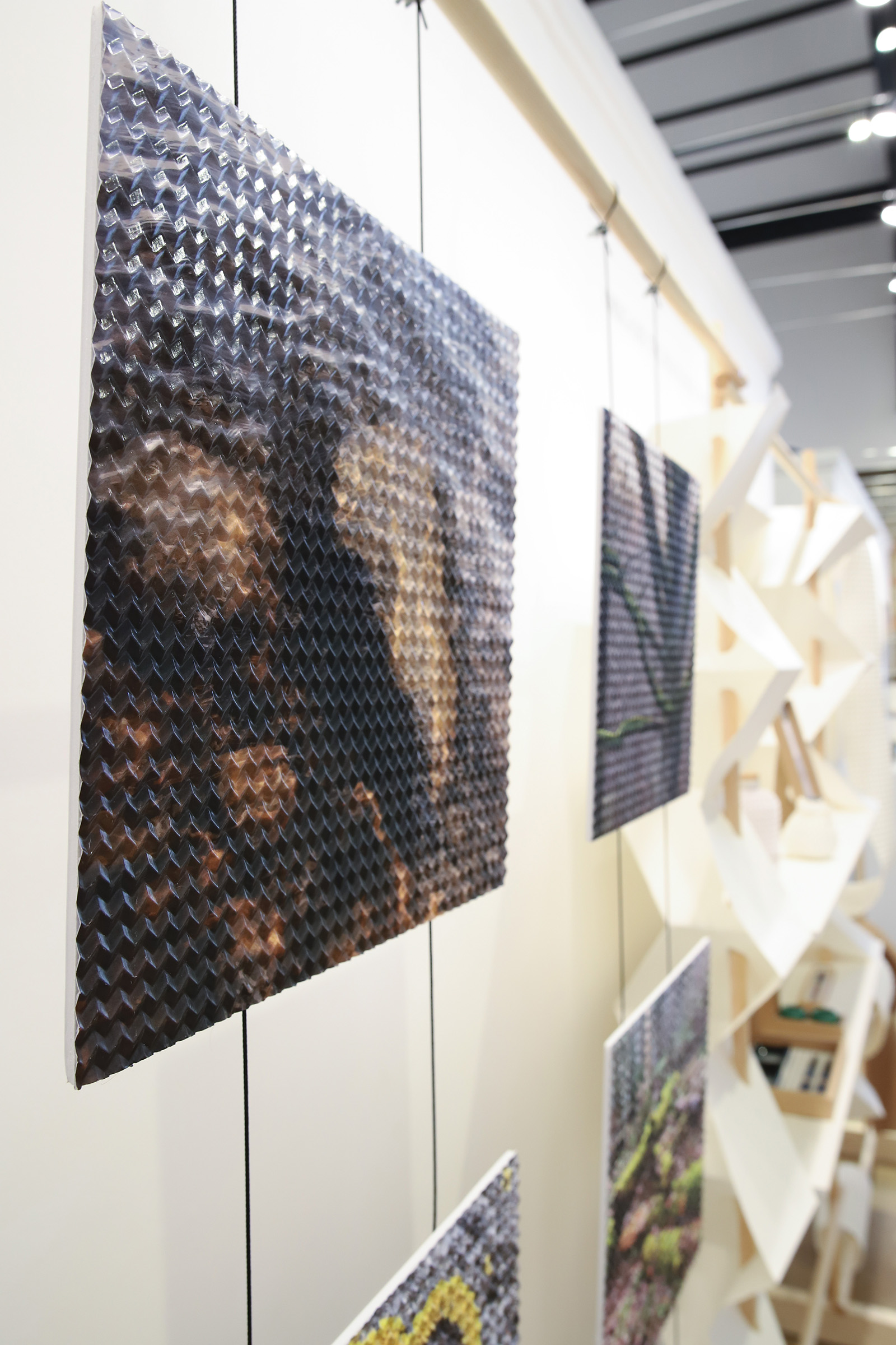 The Miura-ori pattern provides also new possibilities for diverse panel applications and visual outcomes. Nature-themed macro photography works by Markus Joutsela are printed to high quality photography paper, and then processed through the first phase of the folding machinery to create origami surface. The folded structure changes the viewing experience of the image by introducing depth, shifting reflections and subtle variations in light and shadow. As the viewing angle and lighting change, the image takes on a more dynamic and spatial character, bringing a new sense of presence to the photographic surface.